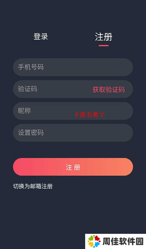 2、有账号密码直接登录即可,首次使用切换为“注册”,输入手机号、昵称以及密码。(注意:昵称里面不能有数字)