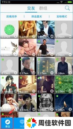 2、登陆成功后即进入到主界面,也就是身边页面,可以查看给你推荐的离你最近的朋友信息,同时你可以根据距离排序、筛选器关、宫格模式进行设置。
