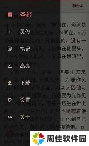 在首页左上角点击按钮,用户可以访问圣经、灵修、笔记和设置等功能。