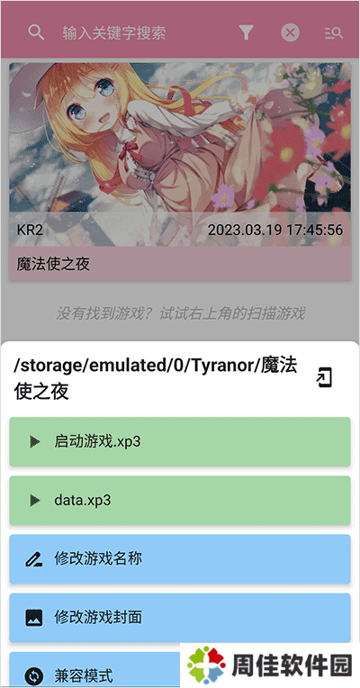 你只需要将游戏文件(部分引擎可能需要解包)放到根目录的Tyranor文件夹下即可, App会自动识别出游戏,游戏列表显示的封面请自己放入游戏中“index.html”或“root.pfs”、 "system.ini“所在的文件夹,图片名就命名为”封面"即可,可以是jpg和png