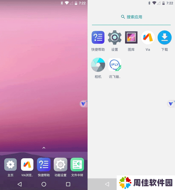 这是开机之后的虚拟机安卓 7 系统桌面情况,系统基本没有安装 APP,除了系统组件,只自带一款 Via 浏览器和讯飞输入法。