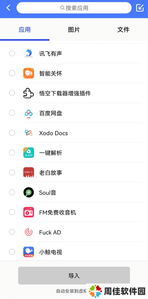 打开文件中转 APP,选择导入,可以从手机中导入已经安装的应用和文件、图片。