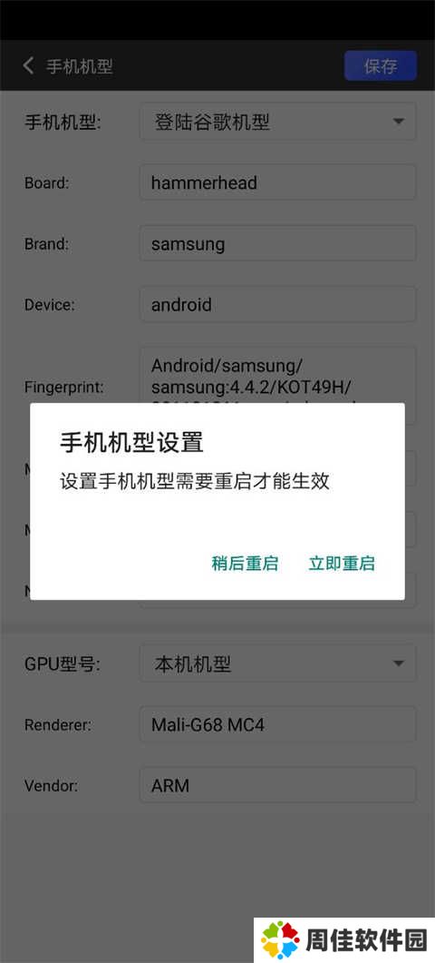 4、在手机机型中选择自己想要设置的虚拟机型,设置完成之后点击保存,然后选择立即重启。
