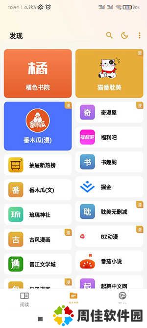 2、在发现板块我们可以发现这里拥有大量的资源,主要是小说和漫画平台的资源,我们选择自己感兴趣的平台即可