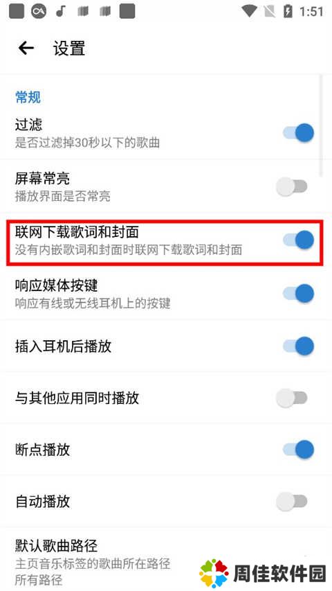 3.在“设置”界面中,勾选“联网下载歌词和封面”选项的勾选开关,开启就可以了。
