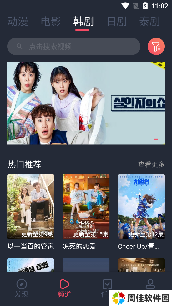 1、在“频道”页面的搜索框中,搜索自己想看的剧或者电影、综艺