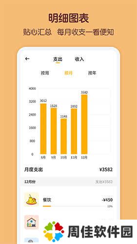 7、统计视图:按周、按月、按年统计记账数据,折线图、饼状图、柱状图一目了然