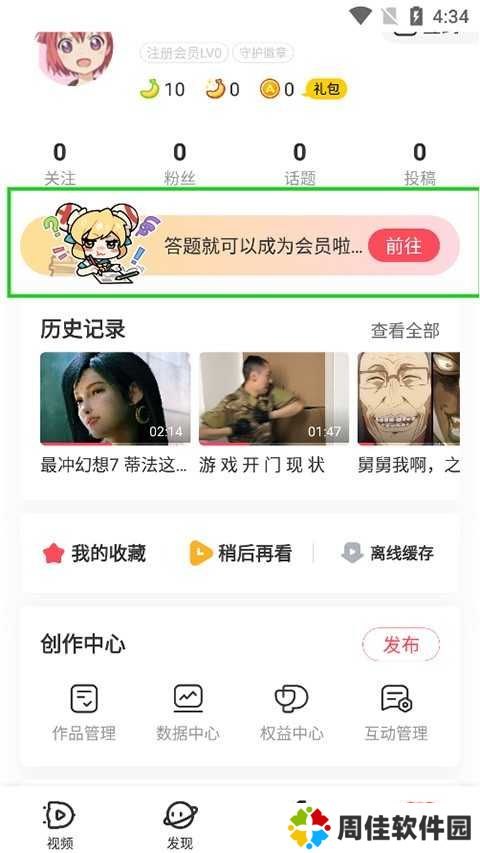 1、用户打开并登录a站手机app,进入【我的】页面中,点击如下图页面中绿**域中的【前往】