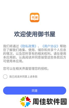 1、首先在这里下载安装“御书屋”,第一次进入到软件界面,我们需要阅读相应的隐私协议,如果觉得没有问题的话点击同意开始使用。