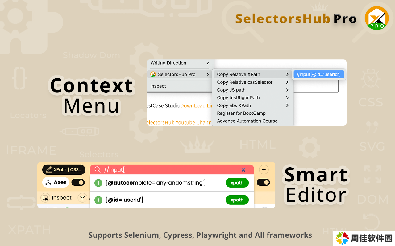 它可以用作智能编辑器来编写和验证 xpath、cssSelector、Playwright 选择器、jQuery 和 JS Path。 SelectorsHub Pro 也可用于自动生成唯一的 xpath、css 选择器和所有可能的选择器。