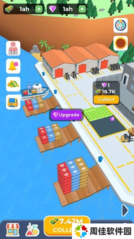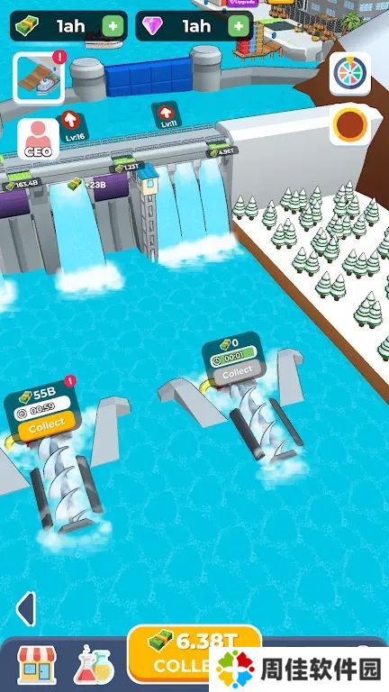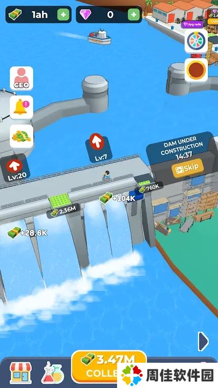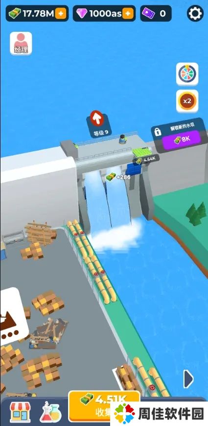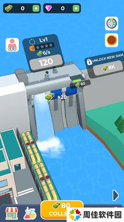 游戏简介:游戏从安静湖面上的一座小水坝开始,逐渐扩展到一座宏伟的巨大水坝,你可以通过控制水的释放来赚取金币。在大坝中,升级大坝中的所有链接并增加您的收入,使用钻石解锁新渔船并扩大您的渔船队。