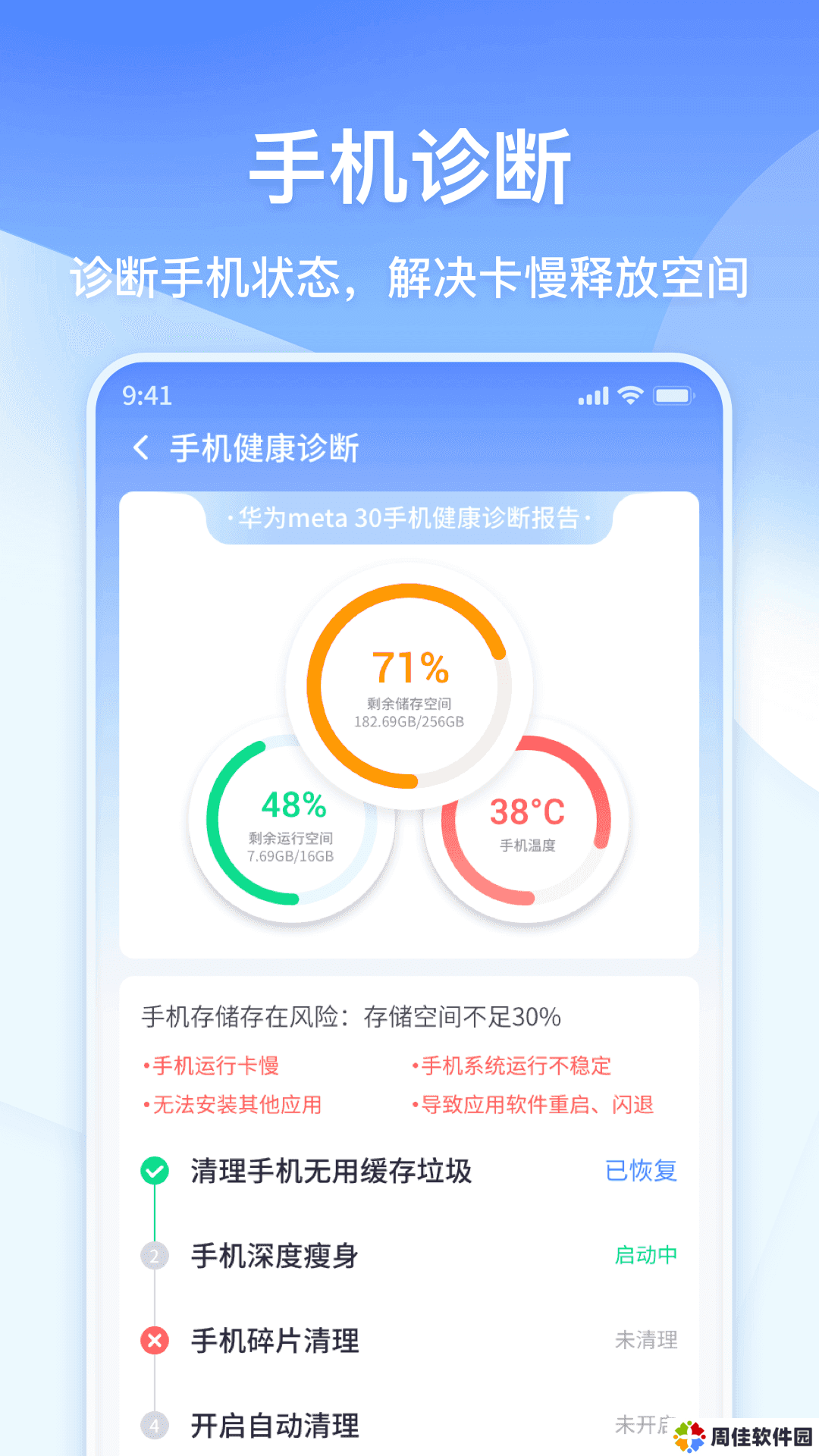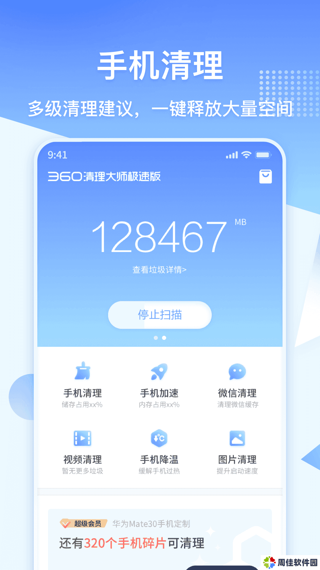 360清理大师极速版官方版是360出品的手机极速版清理工具,在360清理大师极速版官方版中,界面更加精简,同时占用内存小,运行速度上变快,安装包小。除了一键扫描清理基础的*文件之外,还提供了专门的微信清理,为你节省更多空间,使用起来更顺畅。