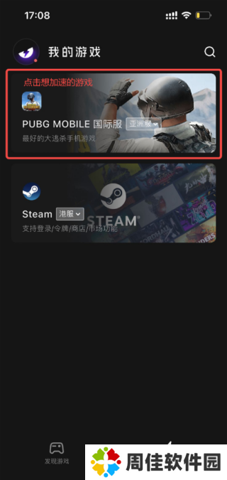 然后点击“我的游戏”或者“发现游戏”,选择要加速的游戏;