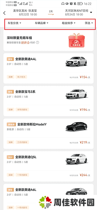 二、用户可以自行筛选车型、品牌、租金等,选择完毕后点击该车辆
