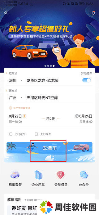 一、打开枫叶租车app,在首页中选择取车点和还车点,日期、上门送、取车后点击去选车