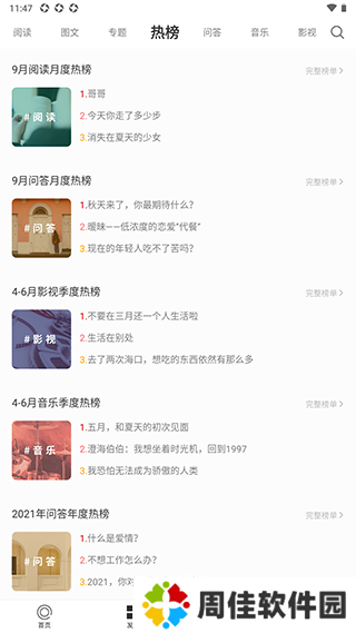 3、点击发现栏,可以查阅各个专栏,包括阅读、图文、专题、热搜榜、问答、音乐和影视等。