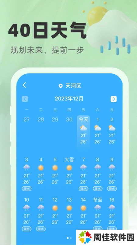 5、15日天气:图例展示各项天气数据,让未来天气变化一目了然。