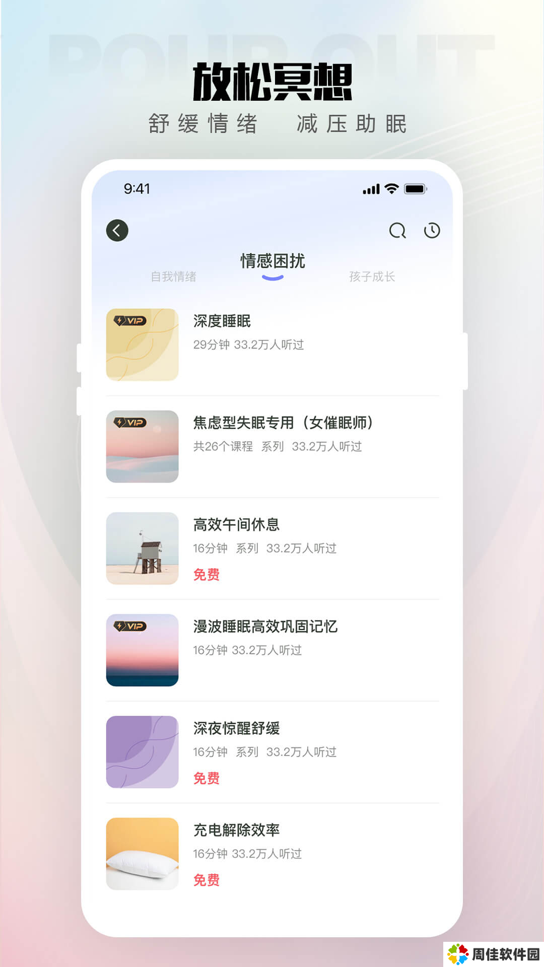 3、解压放松:应用中包含多种专业工具和技巧,帮助用户缓解压力、改善睡眠质量、提高专注力等,有效对抗焦虑和其他身心问题。