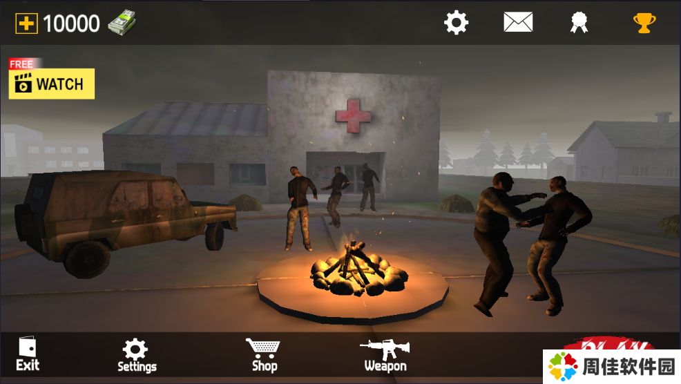1、打开游戏后就可以看到这样一个界面,最下面一栏分别是退出、设置、商店以及武器,点击play就可以开始;