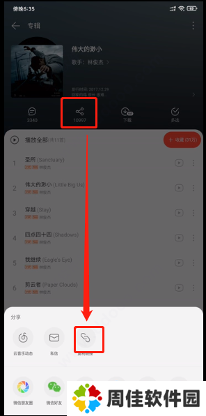 1.到想要下载的歌曲或专辑页面中点击“分享”——“复制链接”;
