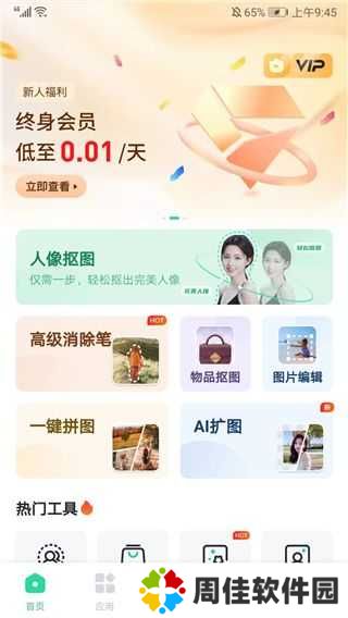 1、打开迅捷抠图app,进入应用主界面,可看到分为首页、应用、设计中心、作品和我的栏目,在当前【首页】界面,包括人像抠图、高级消除笔、物品抠图等实用功能,以人像抠图为例;