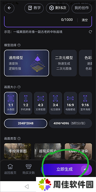 6、输入完毕后点击选择画面大小、整体模型、风格选择、高级设置、作图数量等