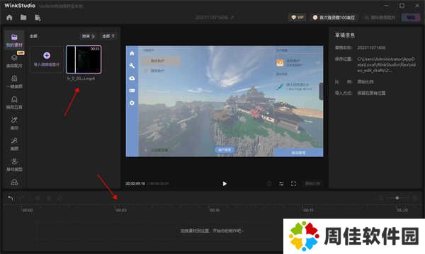3.导入视频文件之后,你会看到视频内容出现在软件的预览窗口中;你可以通过拖动视频内容到下方的时间轴上,开始进行视频创造;