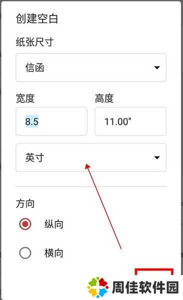 2.在弹出的【创建空白】窗口中选择合适的尺寸以及页面方向,完成后点击窗口右下方【好】按钮。