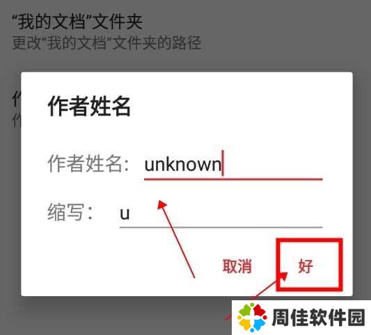 4.弹出【作者姓名】框后就可以修改作者姓名和缩写了,完成后点击右下方【好】来保存设置。