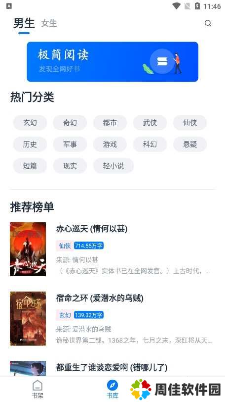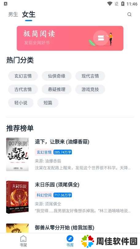 2、将小说分为两大类,男生和女生,然后再进行细致化的分类,让用户能更加便捷的挑选小说;