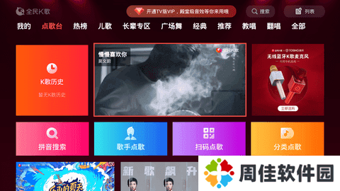 1、将全民K歌TV破解版下载到电视上后打开就可以直接在点歌台中点歌K歌了,提供了拼音搜索、歌手点歌、扫码点歌、分类点歌这几种点歌方法;