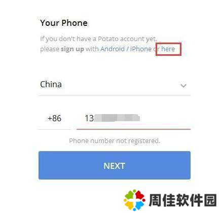 2、软件提示手机号码还没有注册账号,点击蓝色here文字,进入Potato Chat账号注册界面;