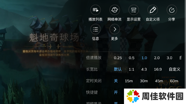 播放过程中点击菜单键会弹出操作菜单,在“显示”一项中包含了常用的显示设置。如屏幕方向、触摸动作和屏幕显示信息等。用户还可以设置跳转时间间隔及拖动支持的操作。