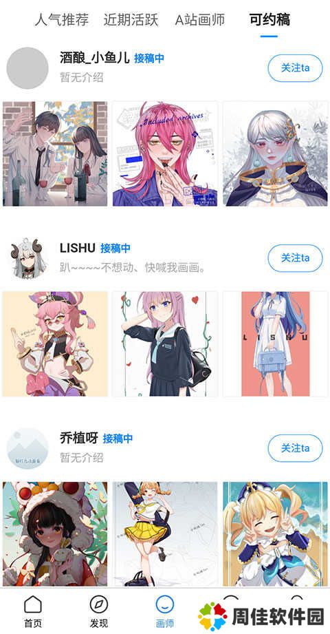 1、来到【画师】界面,点击右上方的【可约稿】页签。