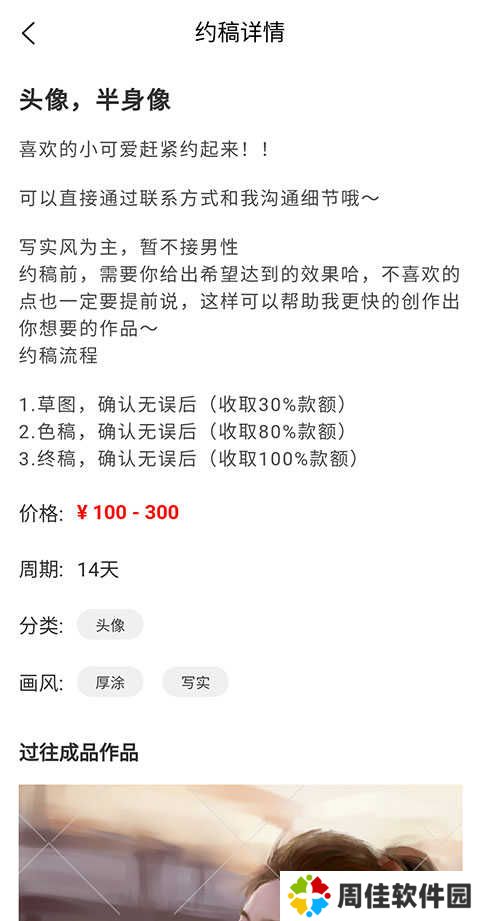 4、接着仔细阅读【约稿详情】,里面有流程、价格,周期等说明。