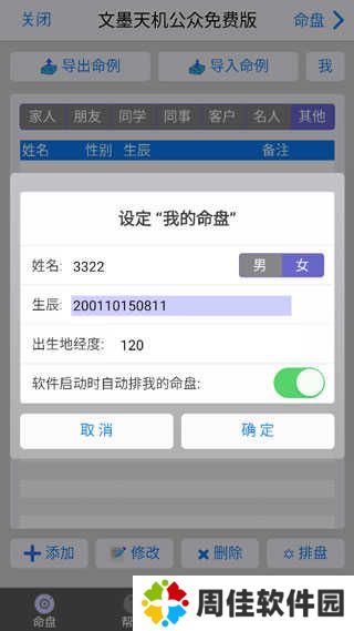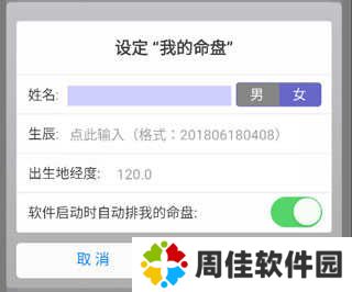 3、输入自己的性别、生辰、出生地经度等排盘信息,设置“我的命盘”。生辰时间是一串12位的数字,其录入结构是:四位“年"、两位“月”、两位“日"、两位“时”、两位“分”,例如2001年6月8日6点08分,录入即200106080608。出生地经度按自己实际的出生地经度填写即可。