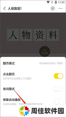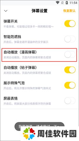 4、在弹幕设置界面,点击把“自动播放”右侧的开关打开,即可自动播放漫画弹幕。