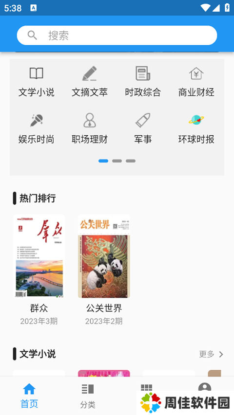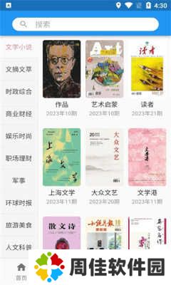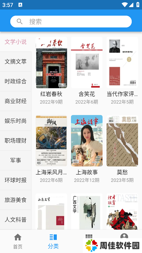 2、用户可以在分类中查找自己想要寻找的不同类型刊物,里面包括文学小说、文摘文萃、时政综合、商业财经、人文科普、家庭养生、农业农村等等类型,涉及的领域非常丰富。