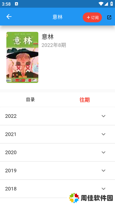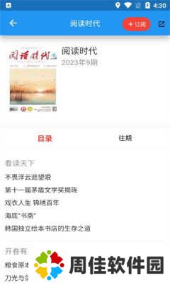 4、点开对应的刊物后,软件会展示杂志内容的目录,还有往期发布的内容,同时支持用户分享好的杂志内容给好友。