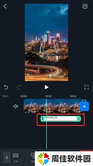 5、选中视频下方音频,用户可以在音频上进行分割,控制音频在视频出现的时间和结束的时间,在右下方音量图标,控制音频在视频中的声音大小,还有淡入淡出的音频效果可供选择。
