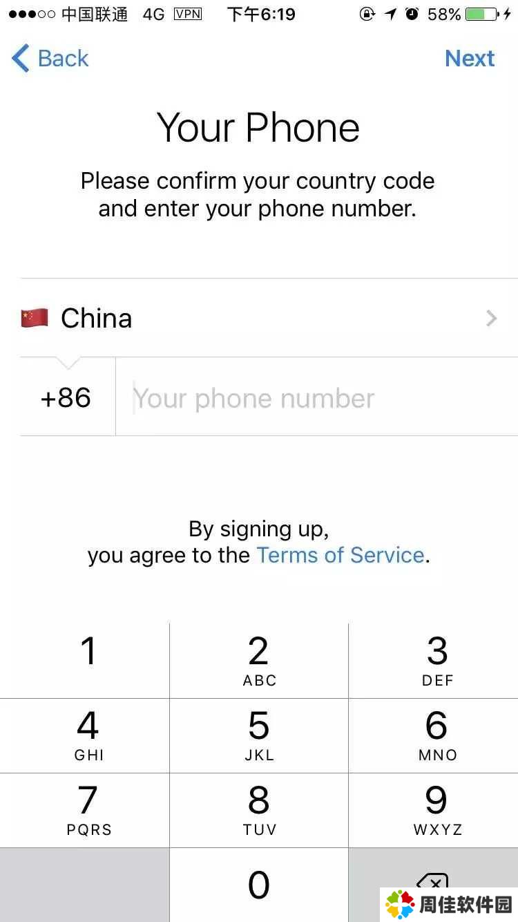 2、在选择国家处选择中国China,填写手机号码,最后点“√”进入下一步