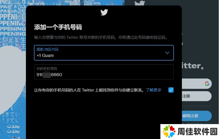 3、进入填写手机号选项里,这里我们把准备好的 Google Voice 号码填写进去,注意:地区代码为 +1Guam,如下图: