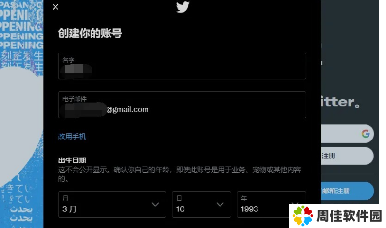 1、打开推特官网:www.twitter.com我们会看到推特官方主页,在主页上可以看到注册按钮,我们这里点击邮箱注册,不要点击手机注册按钮。在弹出的界面填写好你的姓名、邮箱地址、出生日期等信息过后,点击下一步。
