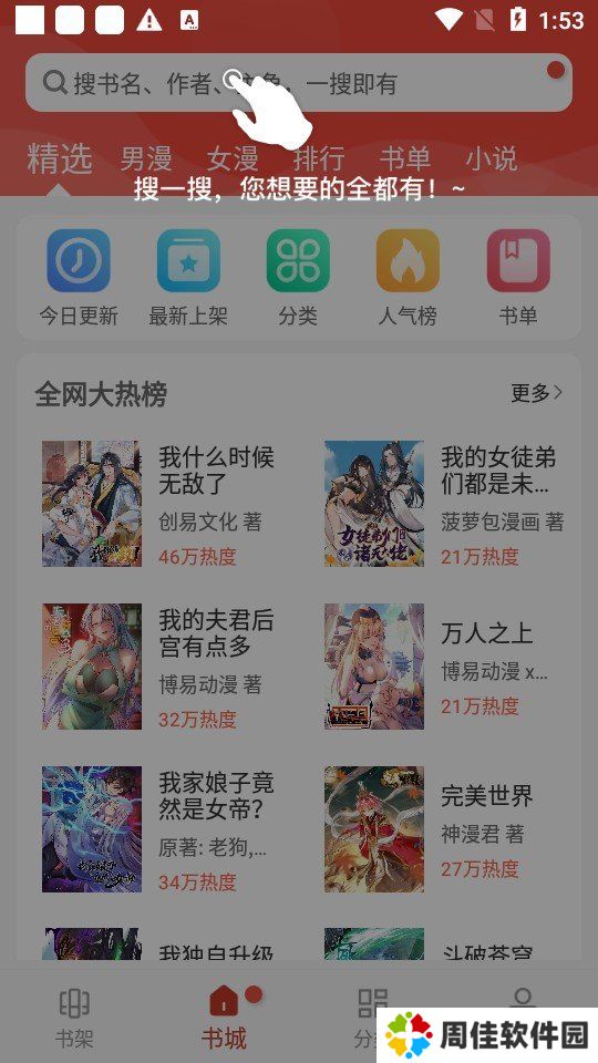 3、个性分类,智慧搜索 分类涵盖题材,精选和作者3种方式,个性化推荐满足漫迷们的挑剔口味;特有的智能搜索引擎,海量关键词汇搜索引导,不再让好漫画轻易从指尖错过!