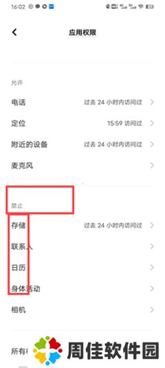 8、里面为用户提供了运行可禁止权限,我们直接看禁止权限的,可以看到储存权限被禁止了,点击进入存储权限。