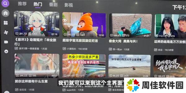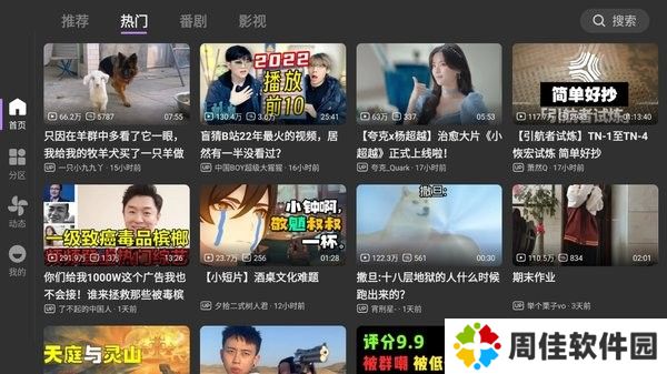 4、这里整个中间是一个主界面,上面是推荐热门番剧影视,有你之前观看过的这些影视。在它的左侧分别是搜索、主页分类、动态以及直播,随便点一个来看一下,可以看到它是支持弹幕的。