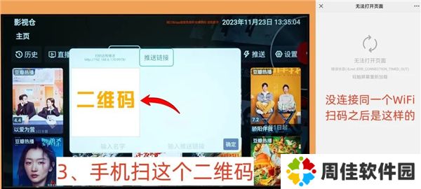 一、创建连接。拿出手机扫码(微信和浏览器的扫一扫都可以),电视和手机需要连接同一个WiFi,不然手机扫码会失败,打不开链接。