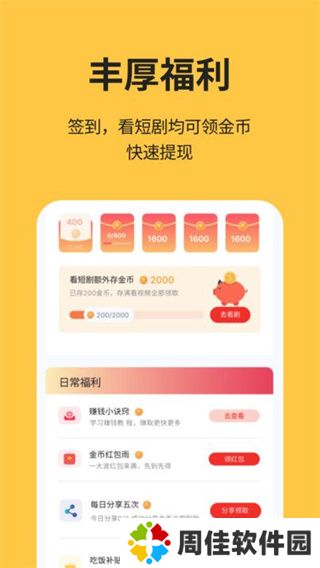 喵短剧app除了可以随时随地看剧外,还为用户提供了丰富的观影任务。超多的福利内容,用户只需每日上线签到,以及完成一定的观影时长,即可领取海量金币。