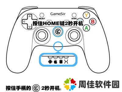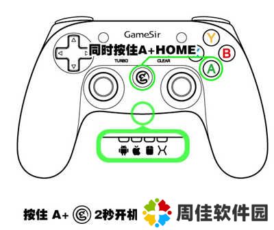 a、同时按住手柄的【A】和【HOME】键2秒开机,安卓指示灯进入闪烁状态;
