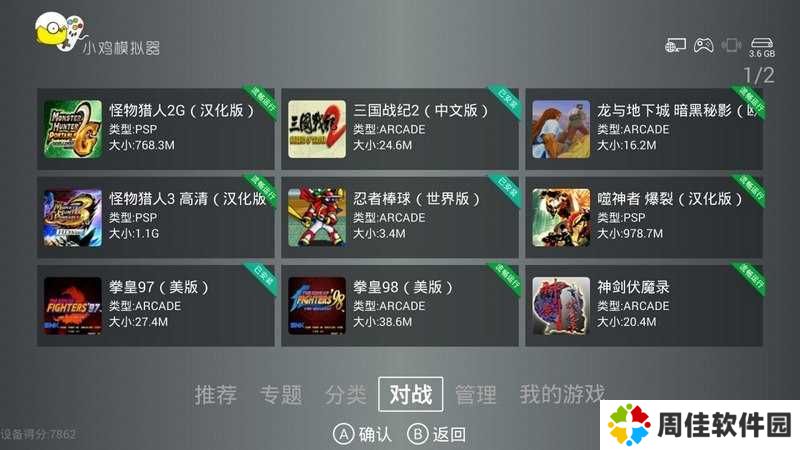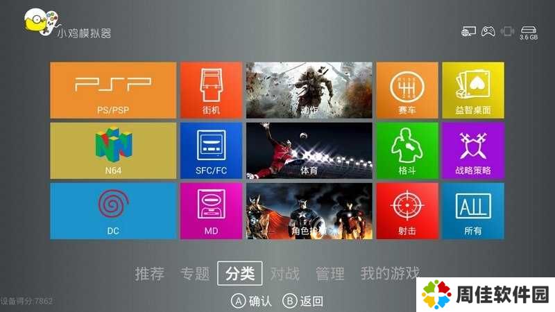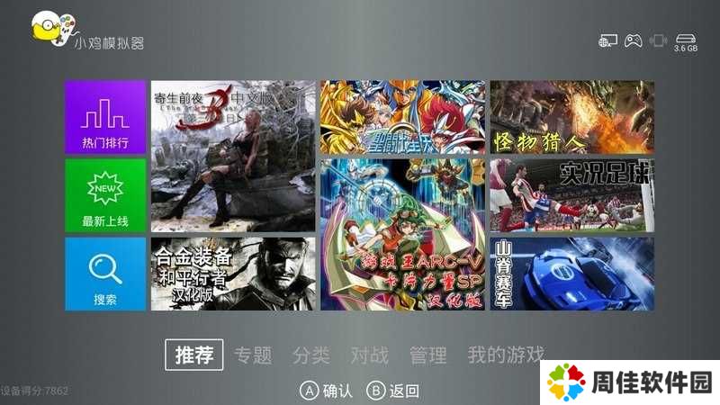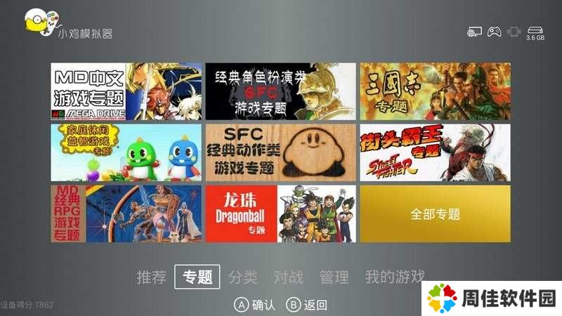 2、打开小鸡模拟器,进入主界面,在画面下方共分有6个项目,分别是【推荐】、【专题】、【分类】、【对战】、【管理】、【我的游戏】,可以通过电视的遥控器与小鸡手柄实现页面之间的切换。